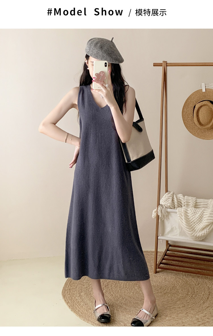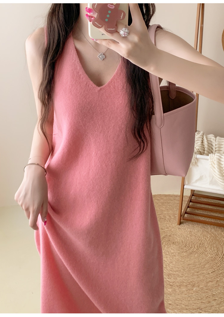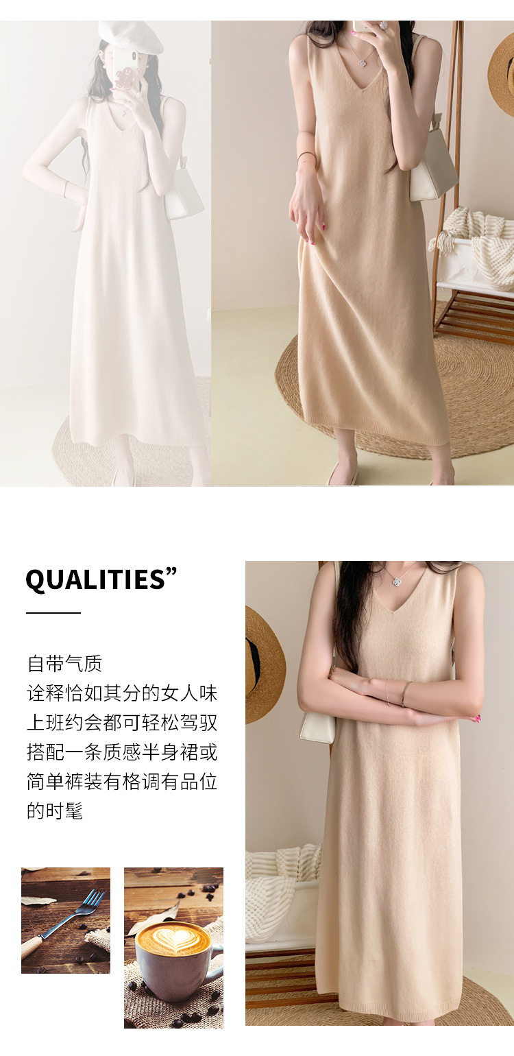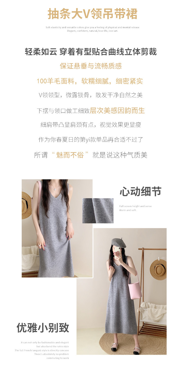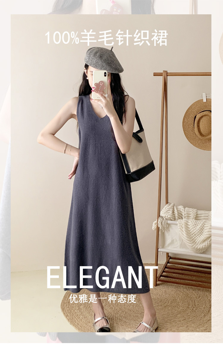纯色V领100%羊毛针织裙打底吊带裙性感修身连衣裙无袖背心毛衣裙
