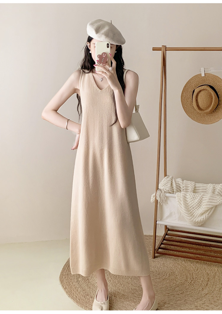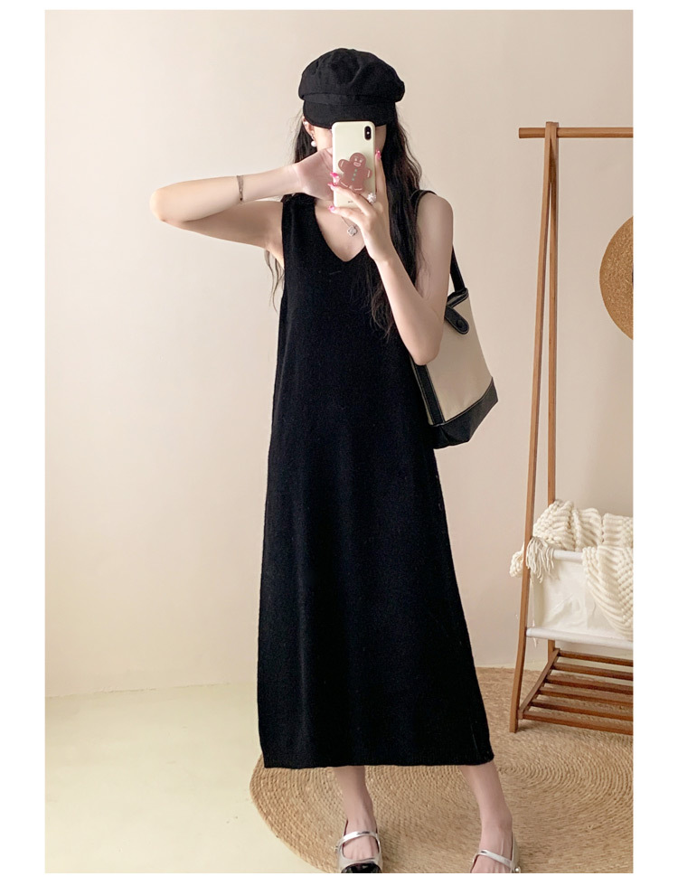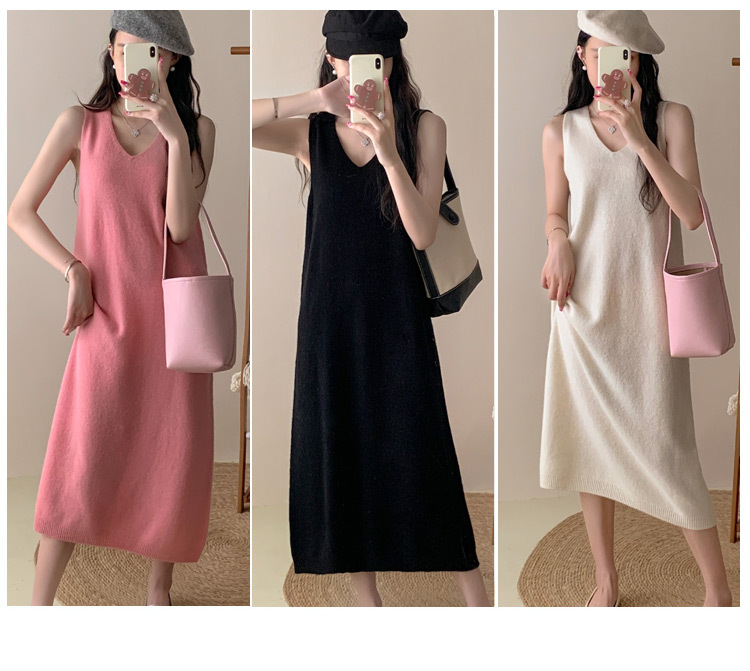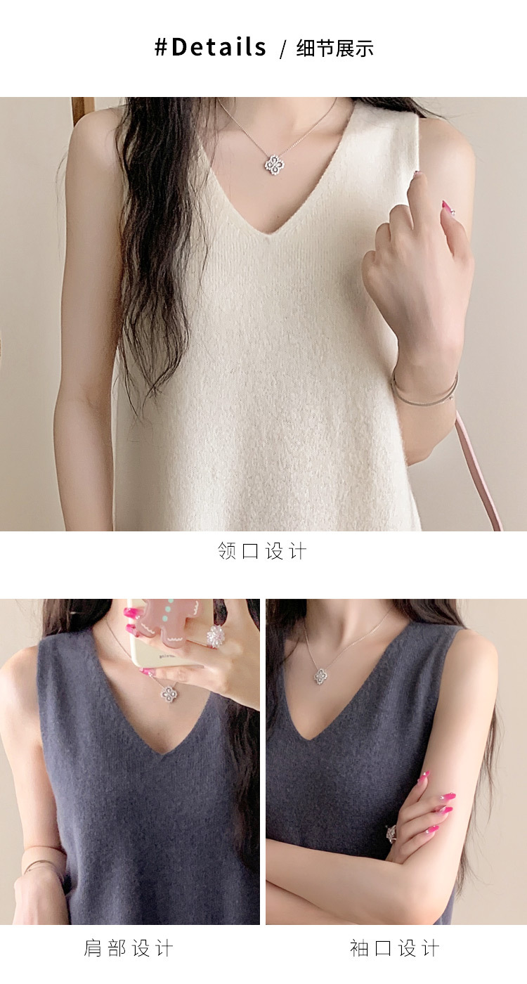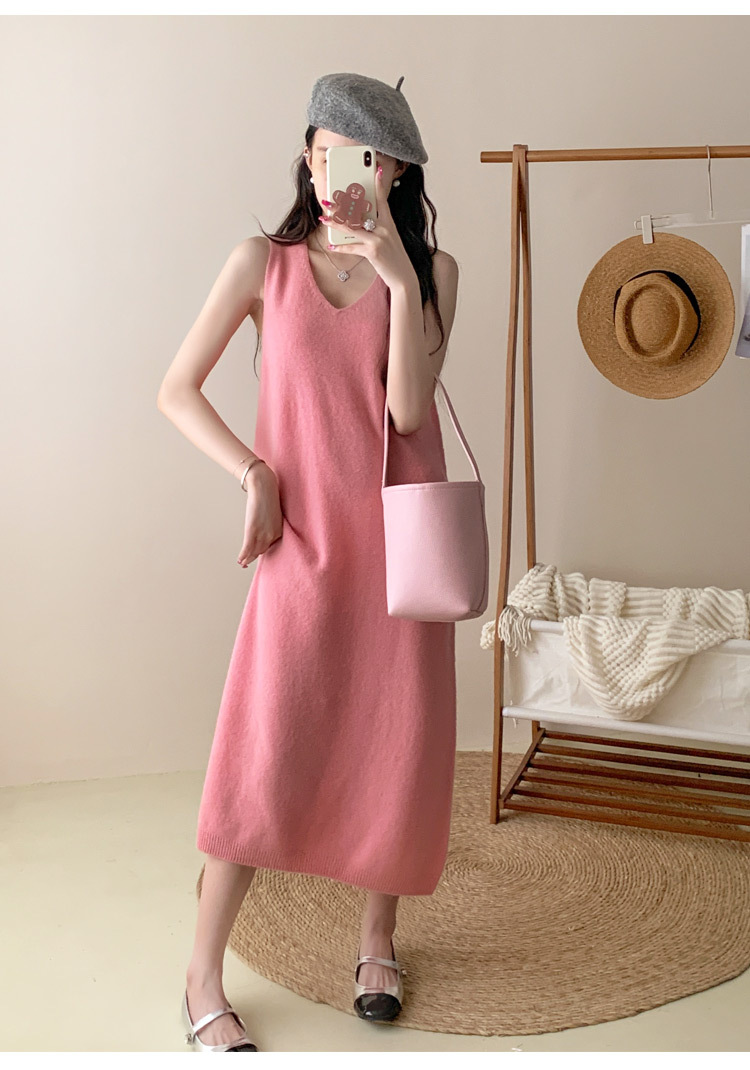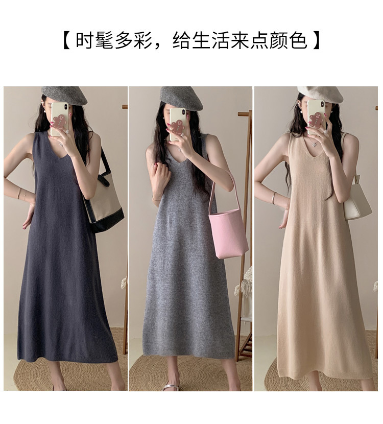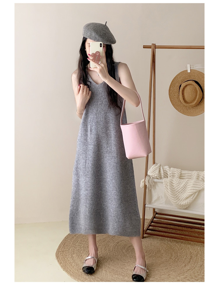 纯色V领100%羊毛针织裙打底吊带裙性感修身连衣裙无袖背心毛衣裙